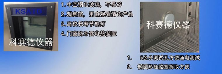 恒溫恒濕試驗機在做低溫測試(-40℃)時工作室的溫度是遠遠低于周圍的環(huán)境溫度的,里面面冷,外面熱,工作室的空氣中的水蒸汽碰到玻璃直接凝華(氣體直接變固體)形成冰霜,妨礙視線,也增加了安全隱患。所以為了解決這個問題,科賽德儀器的恒溫恒濕試驗機上面采用的都是防霧視窗玻璃,采用多層玻璃中空鋁條組合而成,玻璃中間層填充了惰性氣體,原理作用跟真空玻璃杯子類似,然后玻璃上面還安裝了加熱帶,一般試驗箱開始制冷后玻璃的加熱帶也開始通電開始加熱,以達到自動除霧和隔熱作用。