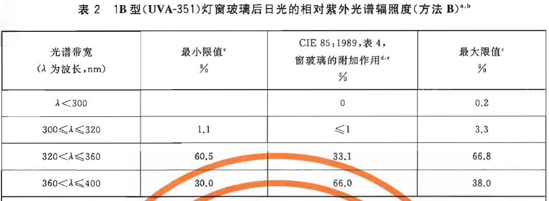 1B 型(UVA-351)熒光紫外燈:這種燈在300nm下的輻射低于總光能輸出的2%,在353nm有發(fā)射峰,用來(lái)模擬經(jīng)窗玻璃后日光的紫外部分,這種燈通常被稱秋UVA-351(見(jiàn)表2)。附錄A中的圖A.2為250nm~400nm下典型的1B型(UVA-351)熒光燈對(duì)比經(jīng)窗玻璃過(guò)濾后日光的光譜輻照度圖。2型(UVB-313)燈可在相關(guān)方協(xié)商同意下使用,但協(xié)商意見(jiàn)應(yīng)在試驗(yàn)報(bào)告中指出。