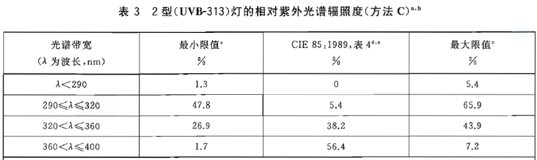 注 1:2型(UVB-313)燈有在313nm水銀線出現(xiàn)峰值的光譜分布并且會(huì)發(fā)射低于λ=254nm的輻射,這會(huì)引發(fā)在最終使用環(huán)境中不會(huì)出現(xiàn)的老化過(guò)程。
